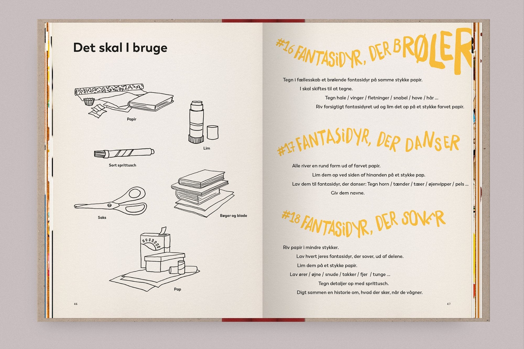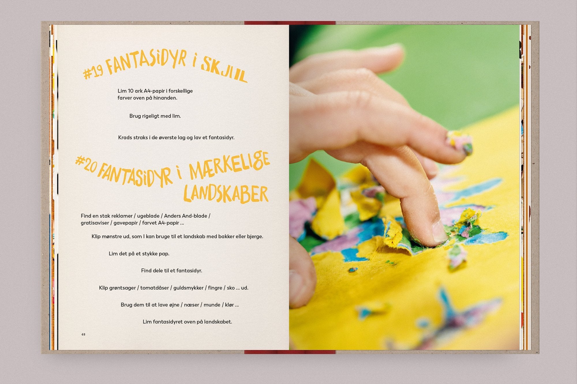Bogen kan købes til privat brug her på webshoppen. En bog, der sætter gang i aktiviteter i hele familien. Arbejd kreativt med forhåndenværende materialer, en kartoffel, et stk. garn, marmorkugler & meget andet og fordyb jer i processen.