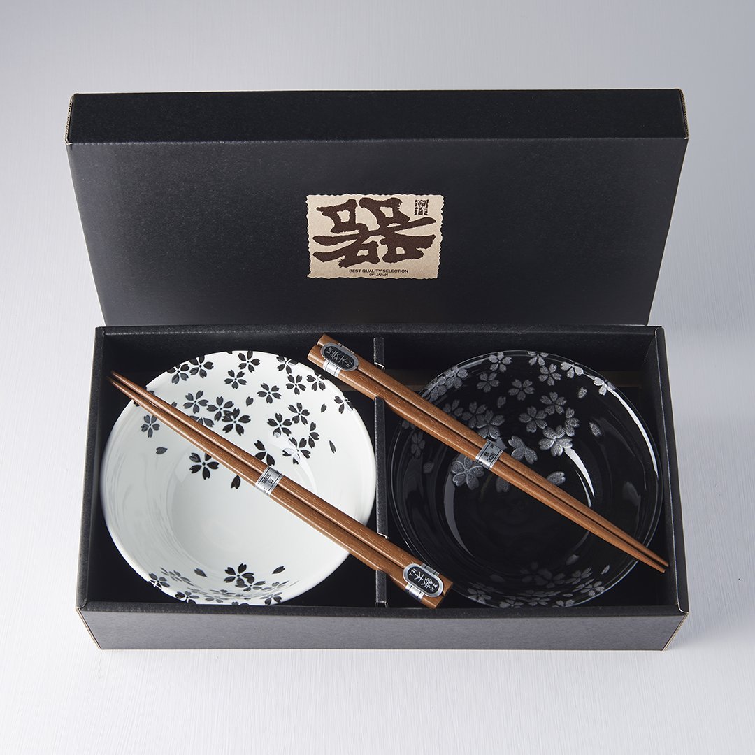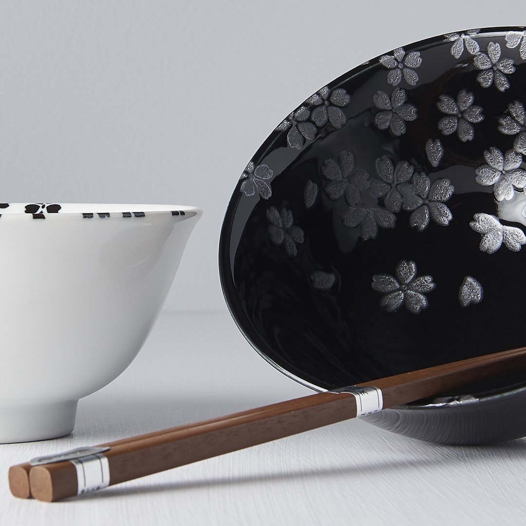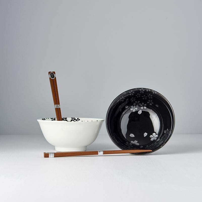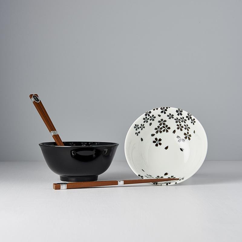 Ceramics Made in Japan · This black and white bowl set with sakura design is made from the finest Japanese ceramics. The set includes two bowls and two sets of chopsticks and comes in a simple black box.