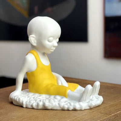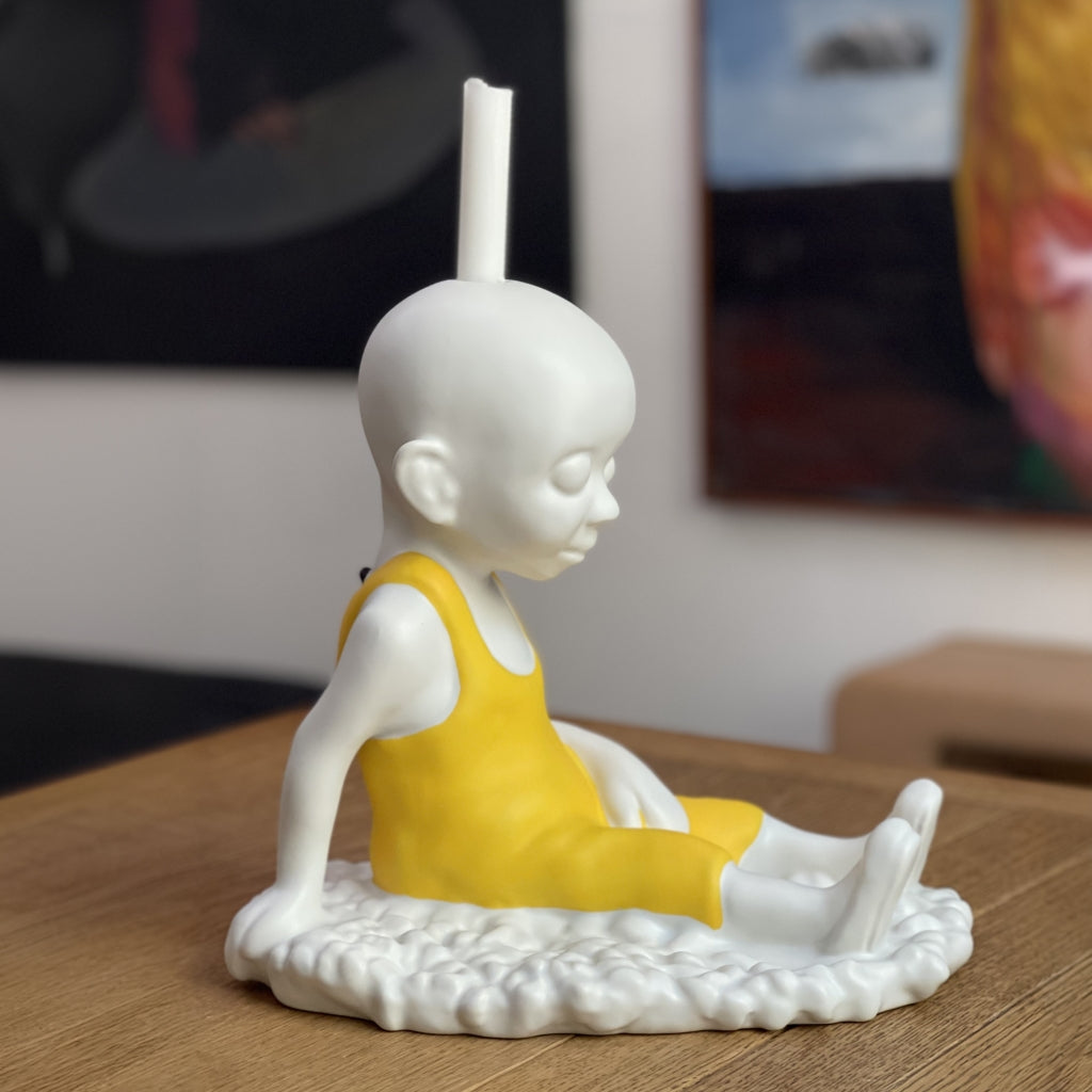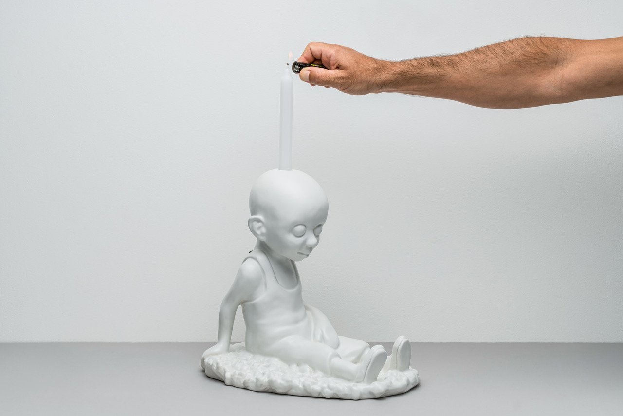 In the third & final design piece created by Kvium for his partnership with Raawii, the ambiguous physiognomy, formless flesh, & anthropomorphic abjection fall away. In their wake, a small, diminutive—if also seemingly dejected—young child sits on a tabletop, a candle jutting violently from his bowed head.