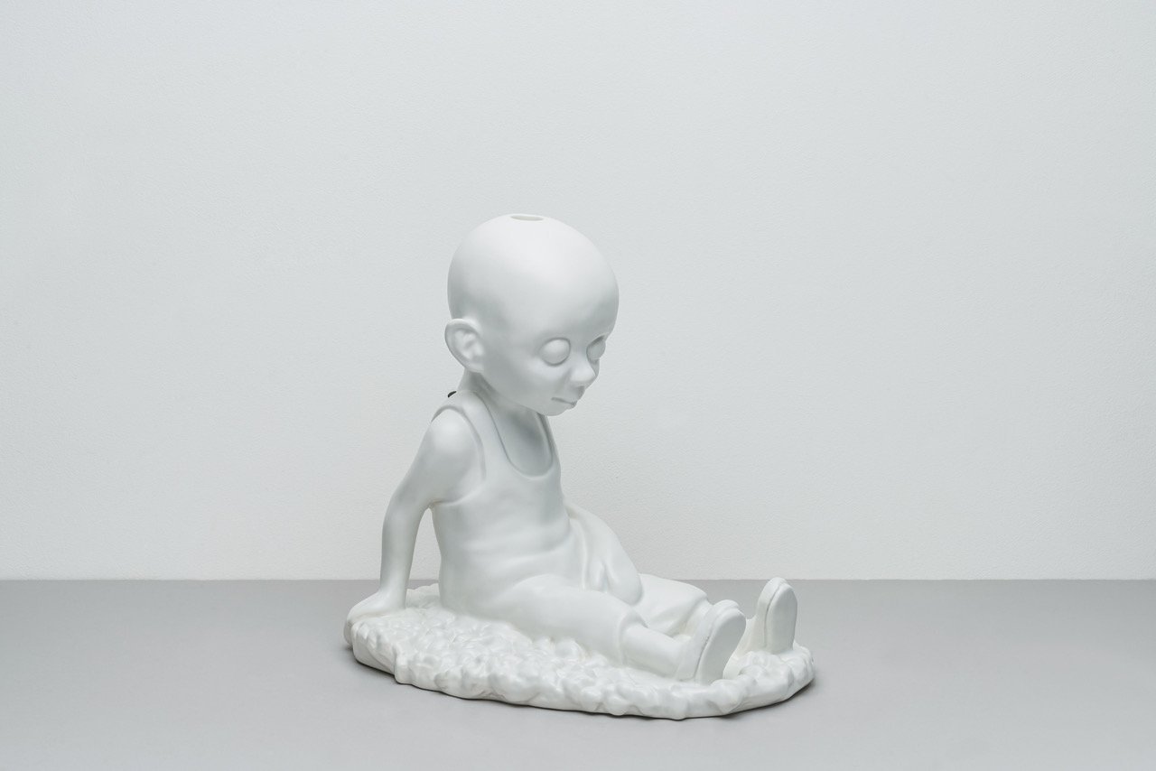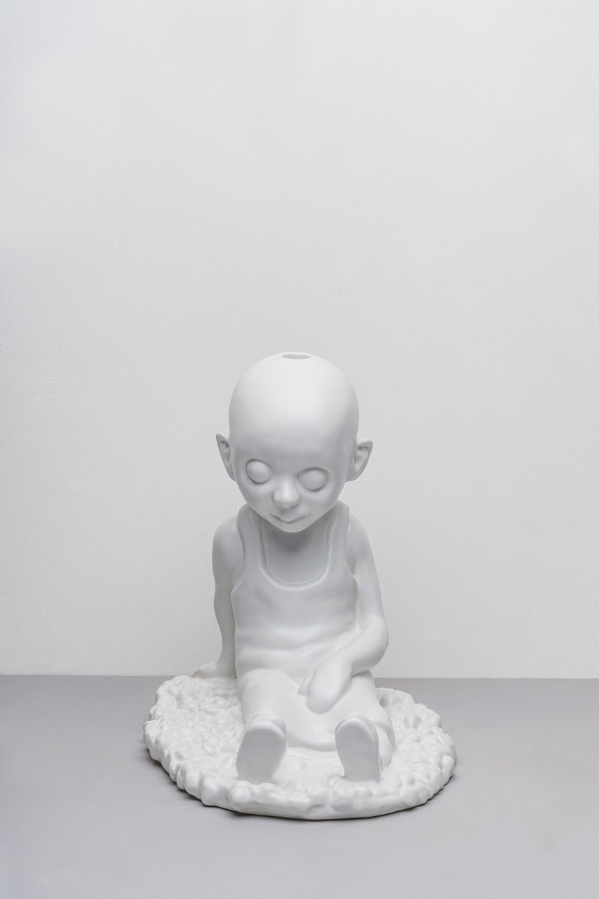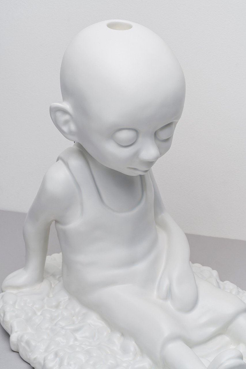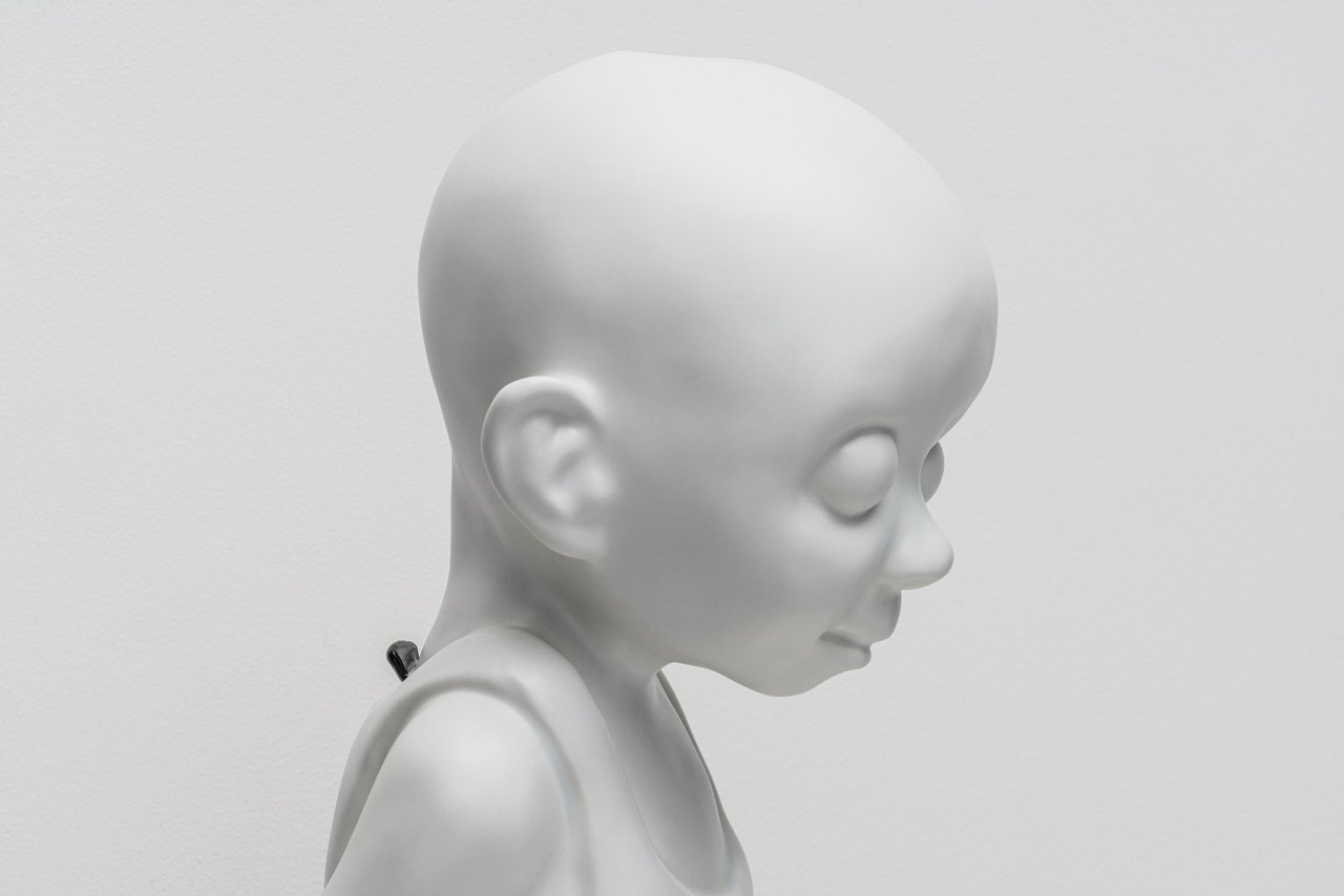 Produced in pure white plaster, with the exception of a single black t-shirt tag emerging askew from the nape of his neck, the uncanny presence belies the portrait what the artist terms a juvenile “puppet”; like many of Kvium’s youthful figures, deprived of agency, this “puppet” is prey to the power & desire of others, especially the prerogatives & politics of a corrupt adult world.