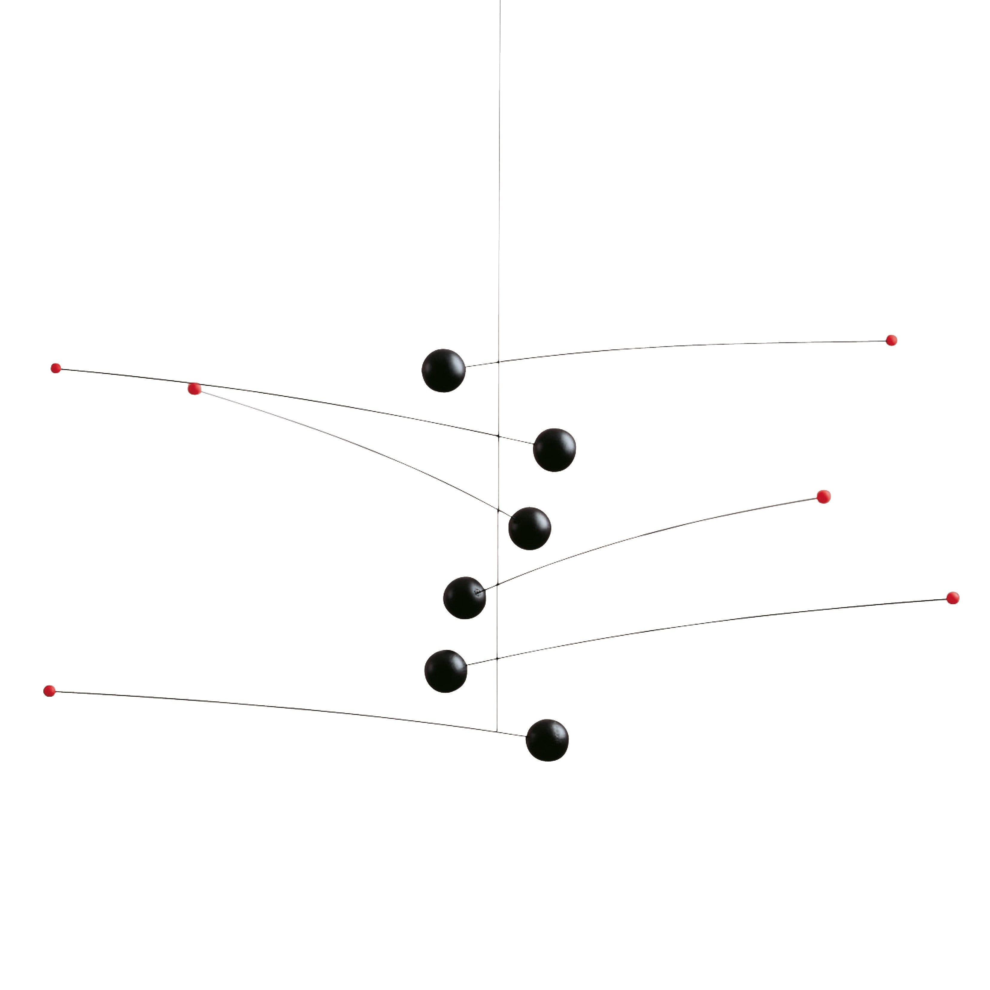 The first mobile by Ole Flensted, designed in 1970. Bars of light and heavy elements in dynamic tension suggests six planets with their moons —or perhaps different levels of the light and the dark sides of the personality?