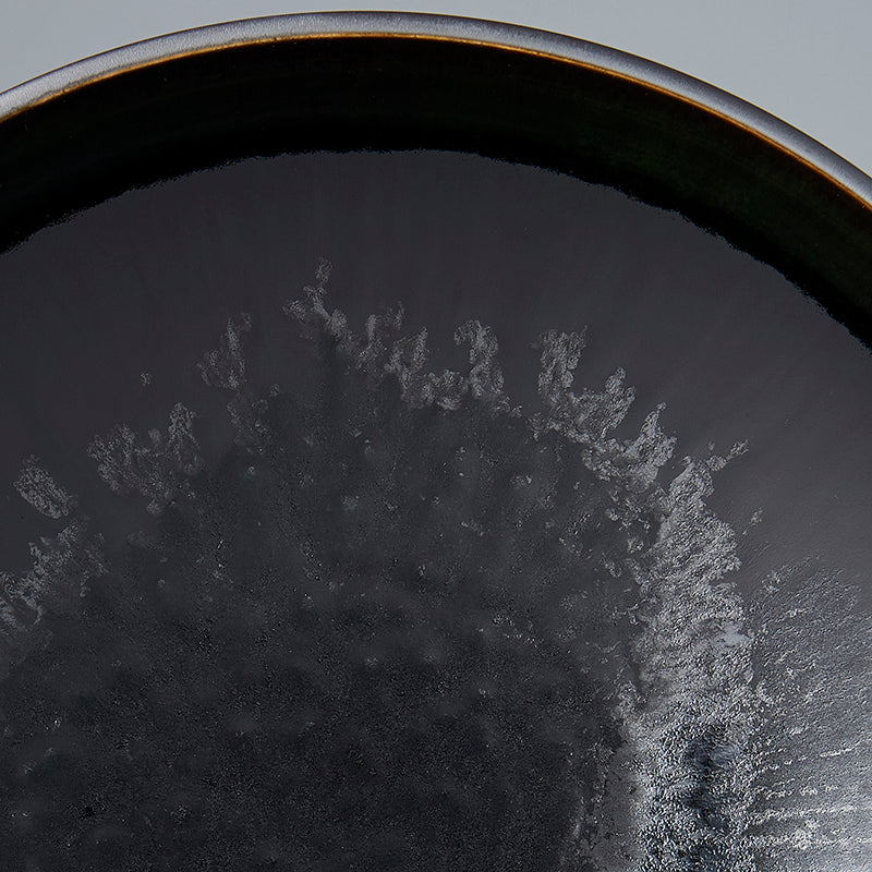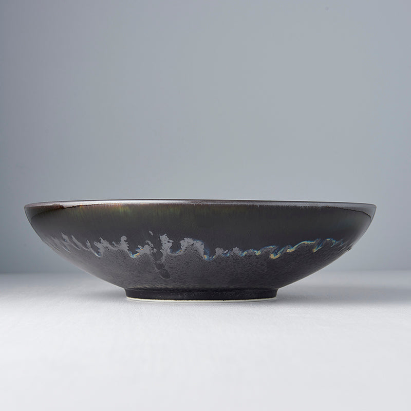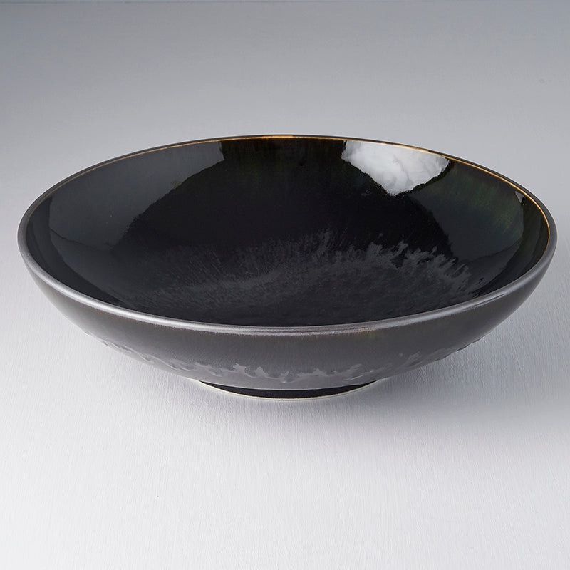 Ceramic Made in Japan · Matt black shallow bowl with irregular & shiny rim. The rims are glazed & in contrast with the grey centre. At the point, where is the matt texture meeting the shiny rim, is an interesting effect which looks like trickling paint. Each piece is unique.